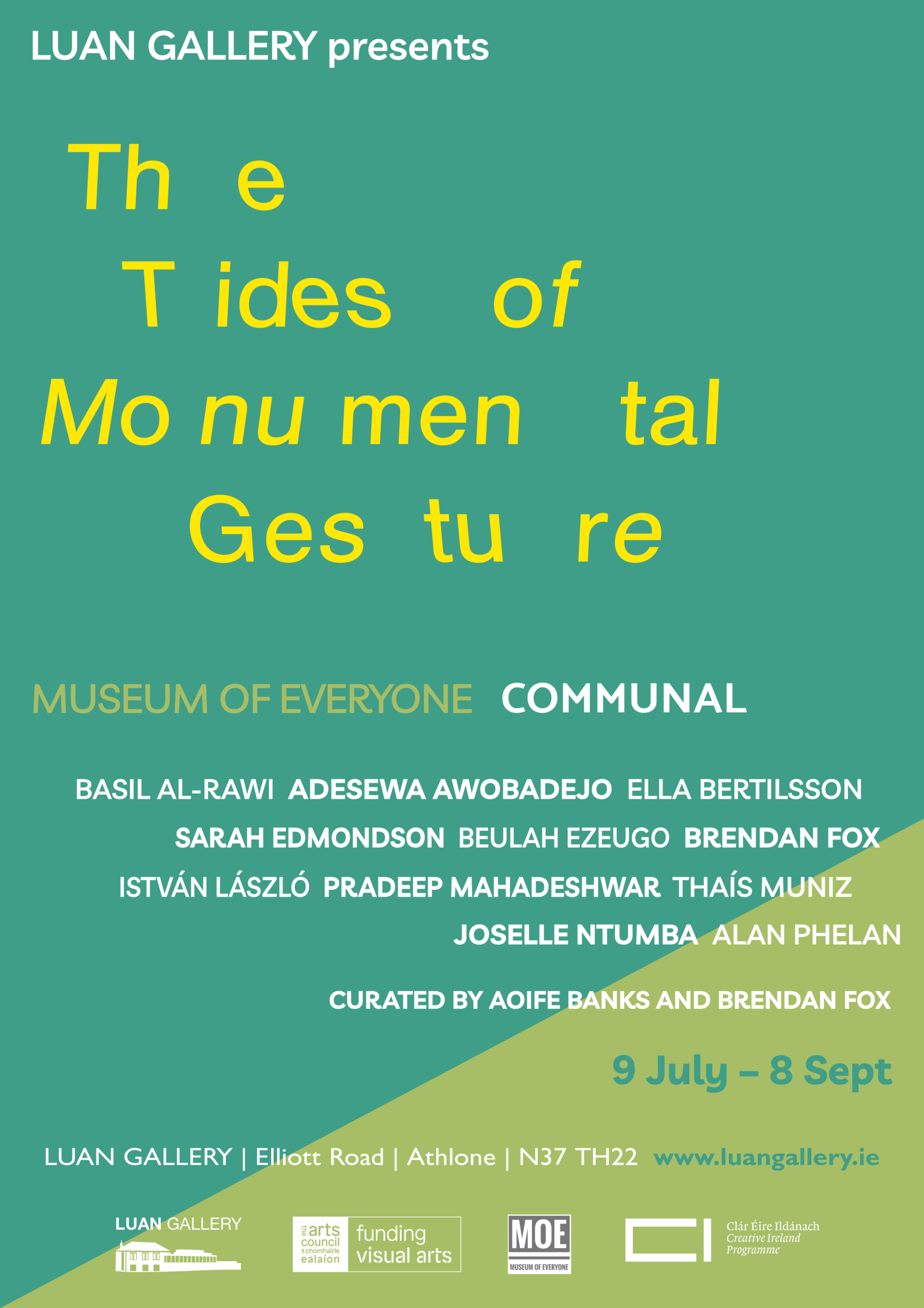 The Museum of Everyone (MOE) is an inclusive portable platform for artists and creatives that aims to amplify diverse voices and perspectives through artist and community-led initiatives. The Tides of Monumental Gesture features the work of ten artists: Irish-Iraqi multidisciplinary artist Basil Al-Rawi, Swedish visual artist Ella Bertilsson, Irish visual artist and educator Sarah Edmondson, Éireann and I’s curator and researcher Beulah Ezeugo and cultural producer Joselle Ntumba with Adesewa Awobadejo, Romanian visual artist and researcher Istvan Laszlo, Indian visual artist and filmmaker Pradeep Mahadeshwar, Brazilian interdisciplinary artist Thaís Muniz, Irish multidisciplinary visual artist Alan Phelan.
